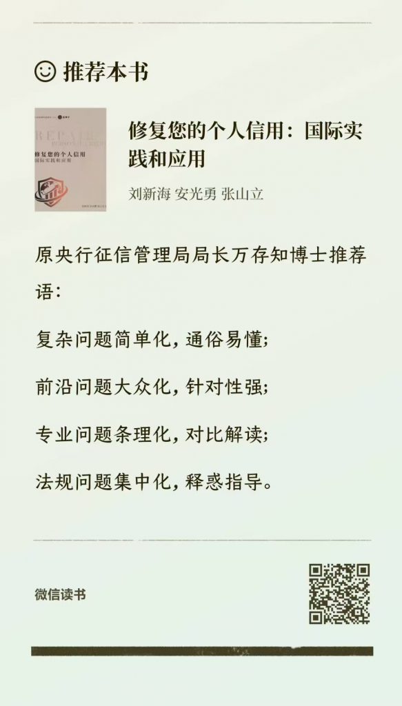 刘新海博士和同事撰写的《修复您的个人信用:国际实践和应用》一书,更是一份严谨、理性的信用修复操作指南。